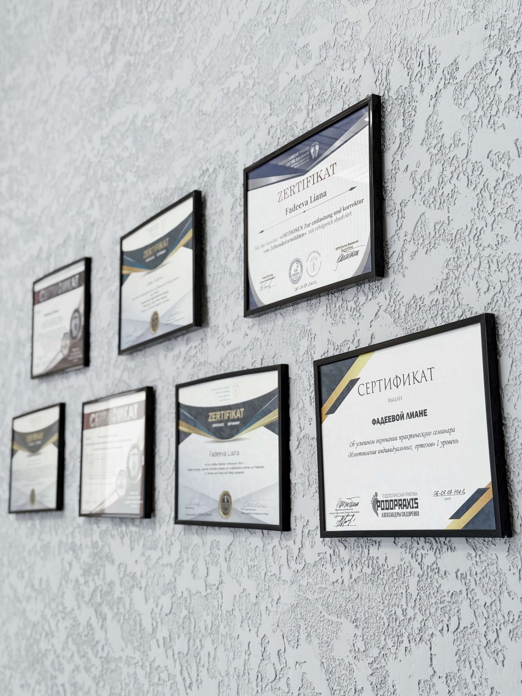 Специалист международного уровня — обучалась у основателя подологии Дитера Бауманна в Москве, стажировалась у руководителя образовательного подологического центра «Школа подологии Дитера Бауманна» в России, Анны Гембихнер.